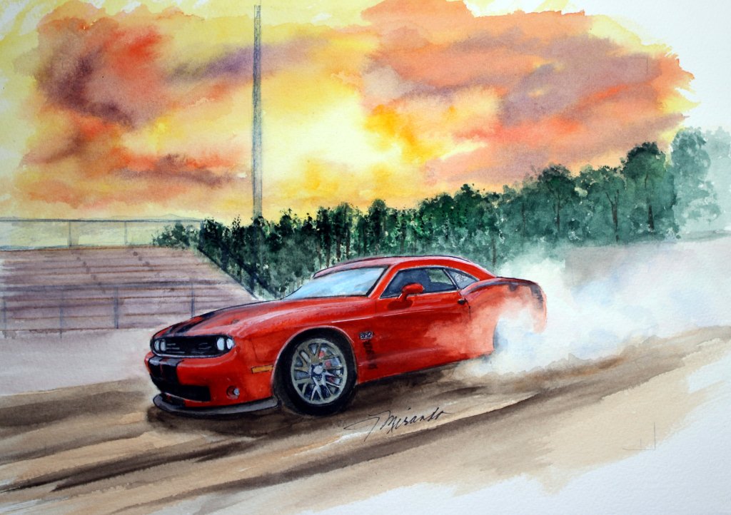 Three very different types of paintings. Loved doing all of them. The Orange Dodge Challenger on the track is a totally new experience. I had a great photo to work from and could really translate the feeling of speed into my painting with the smoke and the track against that fantastic sky.